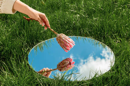hand with flower and sky reflection in mirror