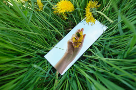hand with dandelion and sky reflection in mirror