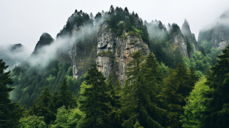 forests in a foggy mist covered region on hill, captured in the style of detailed atmospheric portraits. this high-resolution photo showcases the beauty of nature with the carl zeiss distagon t 15mm f28 ze lens. the green and gray tones create a captivating contrast, reminiscent of ephraim moses lilien's atmospheric watercolors. immerse yourself in the serene outdoor scenes depicted in this stunning image. ai generated