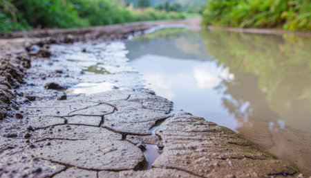 This striking image captures water pooled in cracked earth, showcasing the stark beauty of drought-affected landscapes. The reflection highlights environmental concerns.