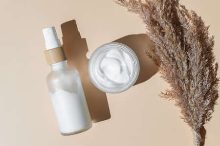 Moisturizer cream jar, serum in glass bottle and toner with green leaves on white background. Flat lay, top view. Set for skin and body care beauty products. Unbranded package with blank labels