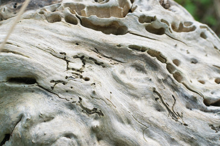 a piece of dried wood with a streamlined shape in a defocused form as a texture object, a natural material for making unique objects, the wooden texture of a piece of an old stump