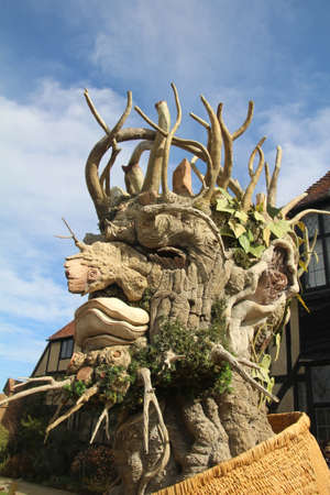 Woking, UK - 21 March, 2020: One of a series of four sculptures representing the four seasons. Constructed of fibreglass in the shape of a figure made from flora (fruit, wood, flowers), this sculpture represents Winter.