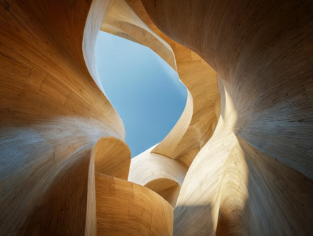 Organic timber arcs intertwine beneath an expansive sky, casting shifting shadows and bathing a sculptural, airy environment in natural illumination.