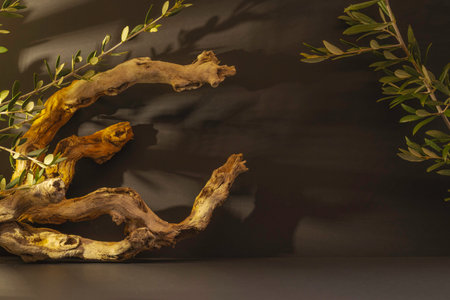 Wooden branch with olive leaves on a black background. Still life