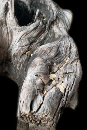 A dried-up tree trunk of a bizarre shape in an old garden. Selective focus.