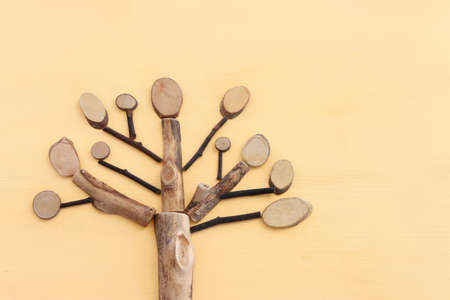 Image of wooden growing family tree on pastel background