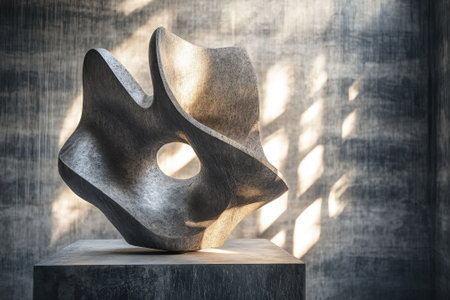A unique abstract sculpture sits on a pedestal, highlighted by gentle sunlight in a contemporary space.