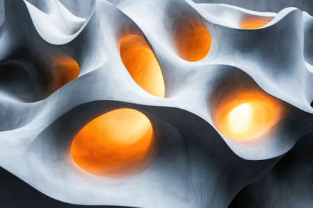 An abstract sculpture showcases a captivating design with hollow structures illuminating a warm glow.