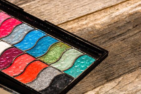 Make up eyeshadow palette close up isolated on wooden background with copy space.