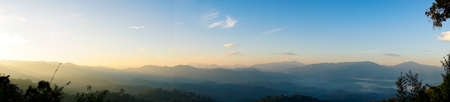 scenic landscape of mountains and mist at sunset time in Nan Province, Thailand.