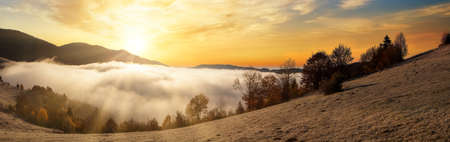 Panorama of the mountain valley filled with fog with meadow and trees in the foreground at sunrise