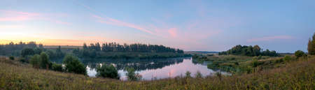 Panoramic view of calm lake and woods at sunrise.
