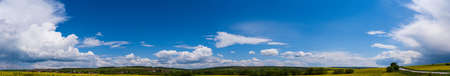 Bright green landscape with meadow, forest, and dramatic sky at sunny day. Ultra wide large hdr panoramic view