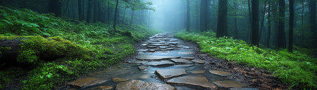 Misty forest path, wet stones leading through lush green trees serene and atmospheric morning light