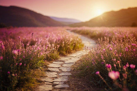 This illustration captures a peaceful mountain path lined with an array of colorful wildflowers in shades of purple, yellow, and pink. The scene is bathed in soft, warm light, enhancing the tranquil mood and inviting the viewer into a serene natural environment. Ideal for use in wellness and relaxation-themed projects. AI-generated illustration.
