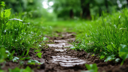 Discover the serene beauty of a green pathway winding through a lush forest, showcasing footprints on soft dirt amid vibrant foliage and peaceful surroundings.