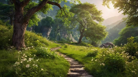 A beautiful forest pathway winding through a lush landscape, illuminated by gentle sunlight filtering through tall trees and vibrant foliage.