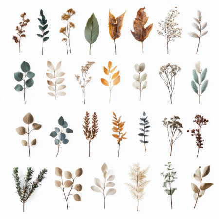 Assorted flowers and leaves in various shapes and colors creatively arranged against a light backdrop