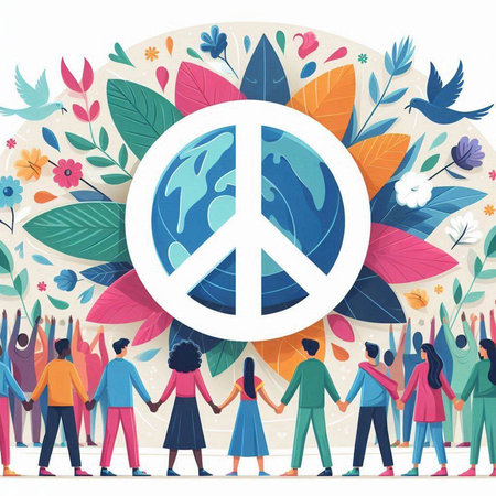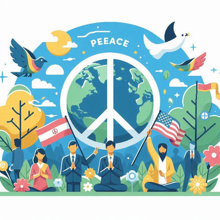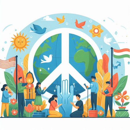 International Day of Peace vector illustration. People with peace sign, dove and planet.