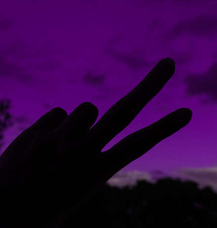 Silhouette of hand showing peace sign with purple sky background.
