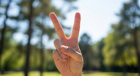 Female hand showing victory sign in the park on a sunny day.