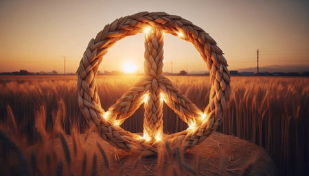 A vintage peace sign made of wheat in golden field, Ai generated image