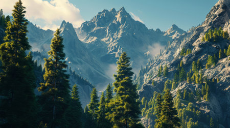 Pine forest on background of mountain peaks. Tourism in mountain valley
