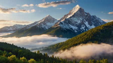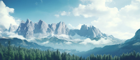 Beautiful alpine mountain landscape with snow covered peaks in the clouds