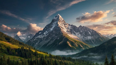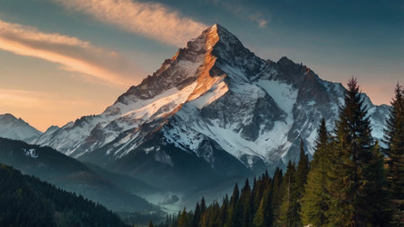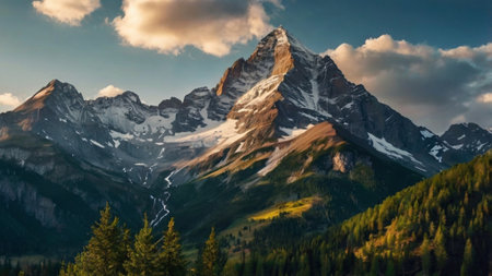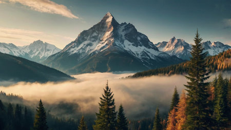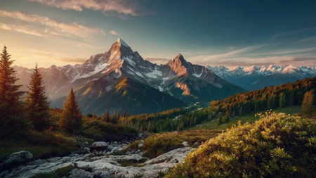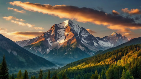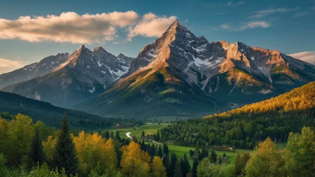 Autumnal mountain landscape featuring vibrant forests and snow capped peaks