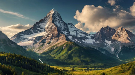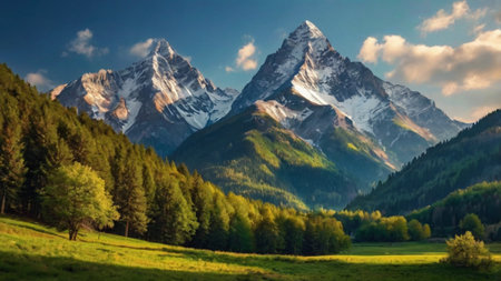 Beautiful alpine landscape with snow-capped mountain peaks.