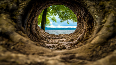 Looking through the hollow of a tree trunk reveals a peaceful lake reflecting vibrant trees and a clear sky on a warm day in nature.