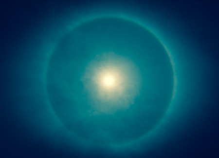 The clear circular rainbow surround the bright sun, its phenomenon of the sun halo. The phenomenon is occurred by the light and moisture refraction.
