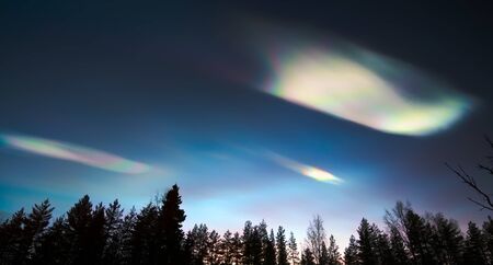 Nacreous clouds in dusk over tree silhouettes.