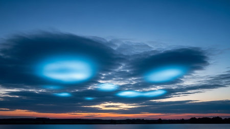 Deep blue twilight sky with luminous bright blue patches within dark clouds over a dark water body.