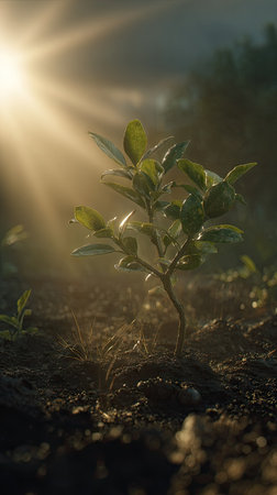 A cinematic wide shot of a young Calamansi growing, slightly larger than before, its trunk and branches beginning to take shape, surrounded by rich, dark soil and faint morning mist, golden sunlight breaking through the clouds, soft beams illuminating the growing tree, ultra-realistic photography with true Earth like realism natural hues, no artificial colors, cinematic composition, deep 3D parallax depth creating an immersive, awe-inspiring atmosphere, subtle natural lens flares, minimal 35mm film grain, tranquil and hopeful tone, 8K, highly detailed