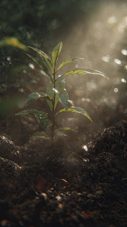 A cinematic wide shot of a young Camellia growing, slightly larger than before, its trunk and branches beginning to take shape, surrounded by rich, dark soil and faint morning mist, golden sunlight breaking through the clouds, soft beams illuminating the growing tree, ultra-realistic photography with true Earth like realism natural hues, no artificial colors, cinematic composition, deep 3D parallax depth creating an immersive, awe inspiring atmosphere, subtle natural lens flares, minimal 35mm film grain, tranquil and hopeful tone, 8K, highly detailed.
