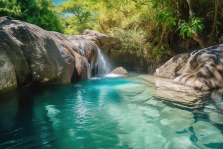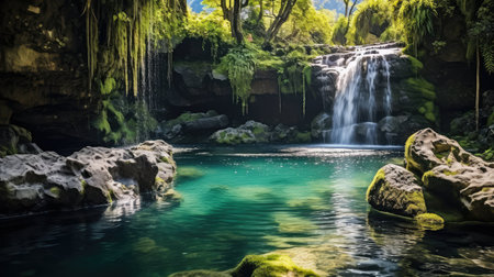 hidden waterfall, surrounded by lush greenery and crystal-clear water, created with generative ai