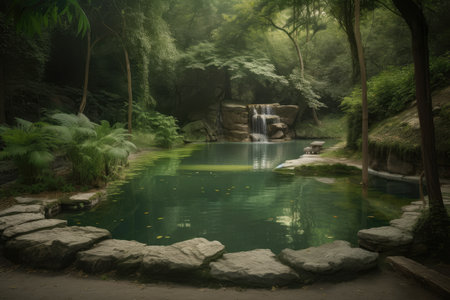 pool surrounded by lush greenery in serene forest oasis, created with generative ai