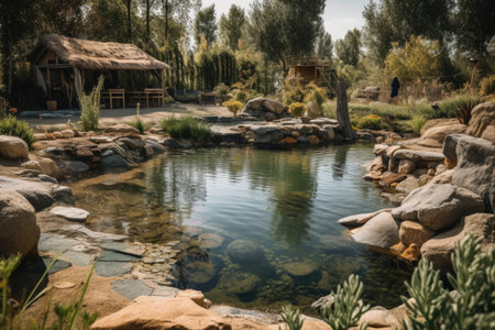 edible landscape with natural swimming pond and waterfalls, created with generative ai