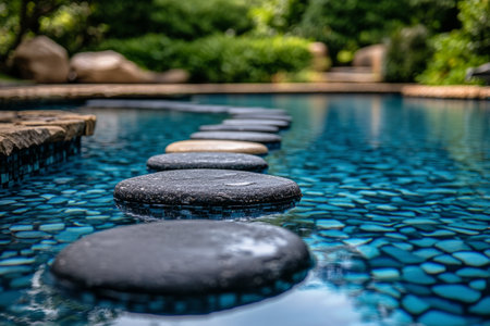 This serene image captures a tranquil garden pool featuring stepping stones and sparkling water reflections, perfect for evoking relaxation and outdoor leisure.