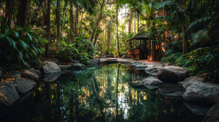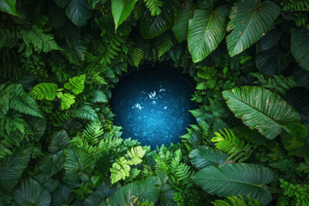 A peaceful circular pool nestled among vibrant tropical foliage, creating a serene oasis. Ideal for relaxation and outdoor mindfulness in lush natural surroundings.