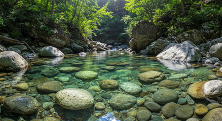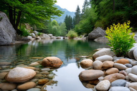 AI Generated. Serene Close Up of Tropical Lagoon with Crystal Clear Water Flowing Gently Over Smooth Stones Surrounded by Lush Greenery and Vibrant Wildlife