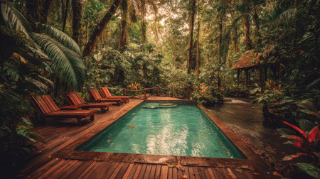 A serene, luxurious swimming pool is surrounded by lush, tropical rainforest foliage.
