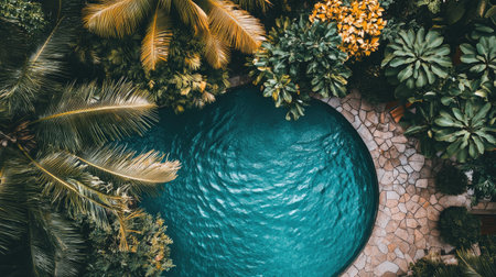 This stunning aerial view captures a tropical pool surrounded by lush greenery, vibrant plants, and a peaceful atmosphere, perfect for relaxation.