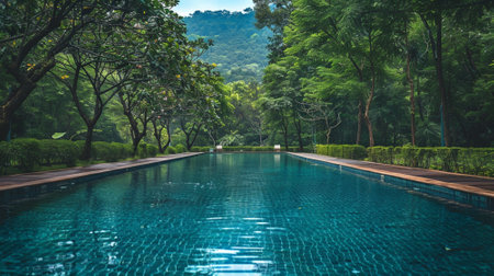 Swimming pool Surrounded by green trees. Green background concept.