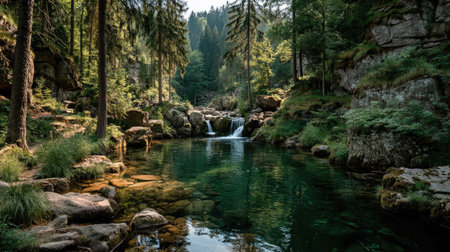 A tranquil forest pool reflects the lush surroundings, with majestic trees and vibrant foliage creating a serene atmosphere perfect for nature lovers.