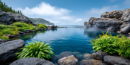 Serene blue hot spring surrounded by coastal rocks and lush greenery offering an ocean view