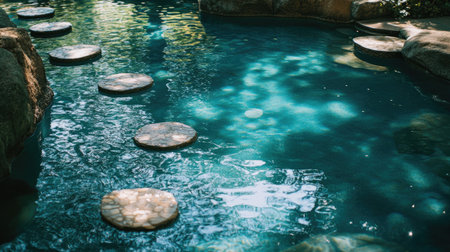 A serene view of a pool featuring stepping stones that create a unique pathway across the still, clear water, surrounded by vibrant greenery and soft reflections.