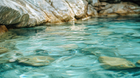A peaceful scene featuring clear turquoise water gently lapping against a rocky shoreline, showcasing the beauty of nature and tranquility.